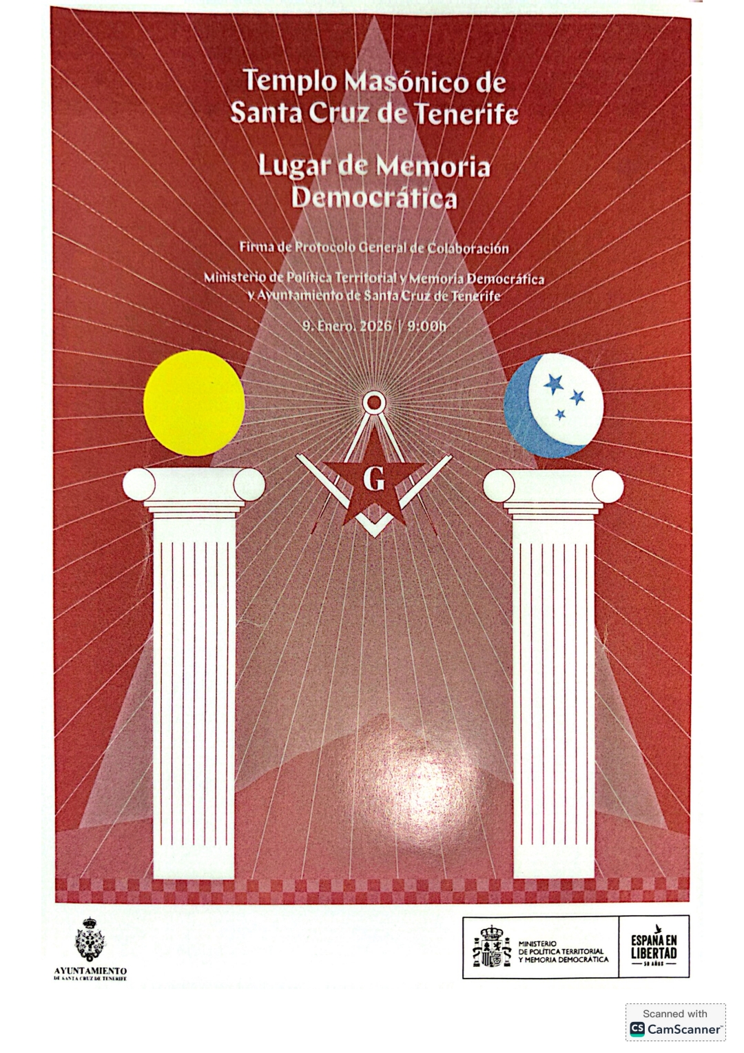 Der Verein zur Wiederherstellung des freimaurerischen Gedächtnisses unter dem Vorsitz von Emilio Fresco und die Großloge der Kanarischen Inseln wurden zur Unterzeichnungszeremonie eines Kooperationsprotokolls zwischen dem Ministerium für Demokratisches Gedächtnis und der Stadtverwaltung von Santa Cruz de Tenerife sowie zur Bekanntgabe der Veröffentlichung der Eröffnung der Akte zum Ort des demokratischen Gedächtnisses des Freimaurertempels von Santa Cruz de Tenerife im BOE (spanisches Amtsblatt) eingeladen.